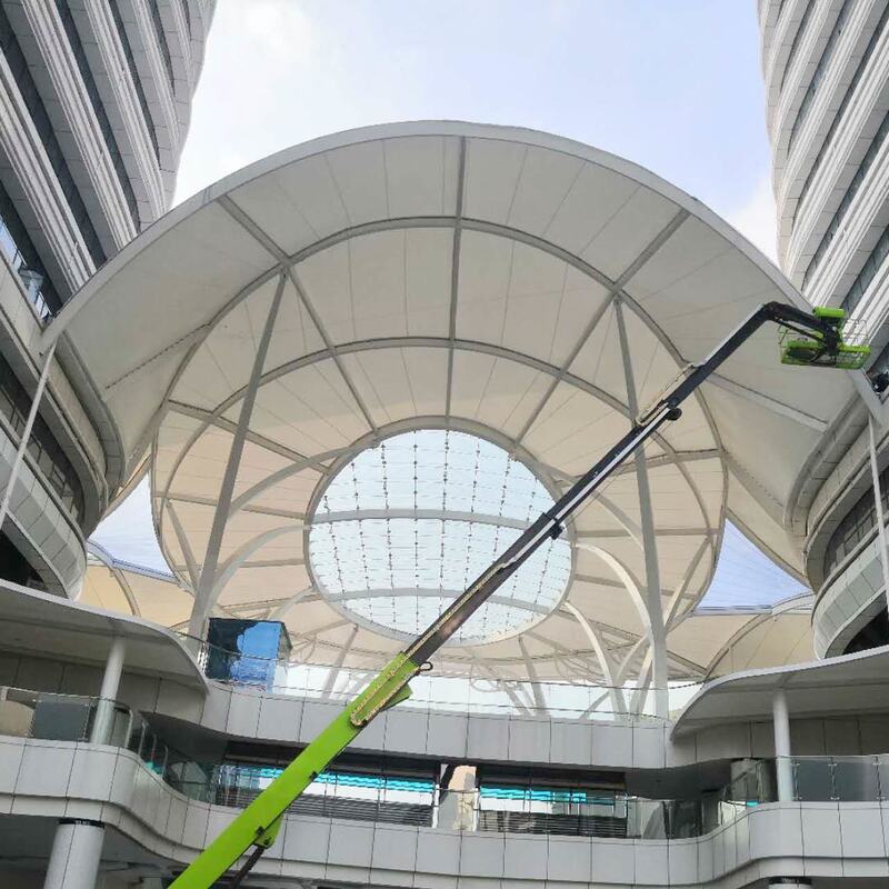 Cette membrane de construction PVDF a des épaisseurs standard de 1,0 mm à 1,03 mm, des largeurs de 1000 mm à 1800 mm et des longueurs de 50 m à 100 m. Des couleurs personnalisables sont offertes.Il dispose d'une excellente résistance aux UV, auto-nettoyage, résistance à la flamme et isolation thermique., et est utilisable pour les murs du toit du stade et la structure de la membrane de tension.